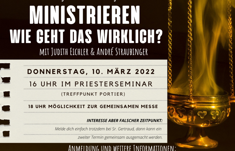 In einem ersten Treffen am 10. März gibt es die Möglichkeit mit zwei erfahrenen Studierenden zu üben, die sich liturgisch gut auskennen, schon lange ministrieren und Minis begleiten. Hier kann man einfach Fragen stellen und gemeinsam üben.