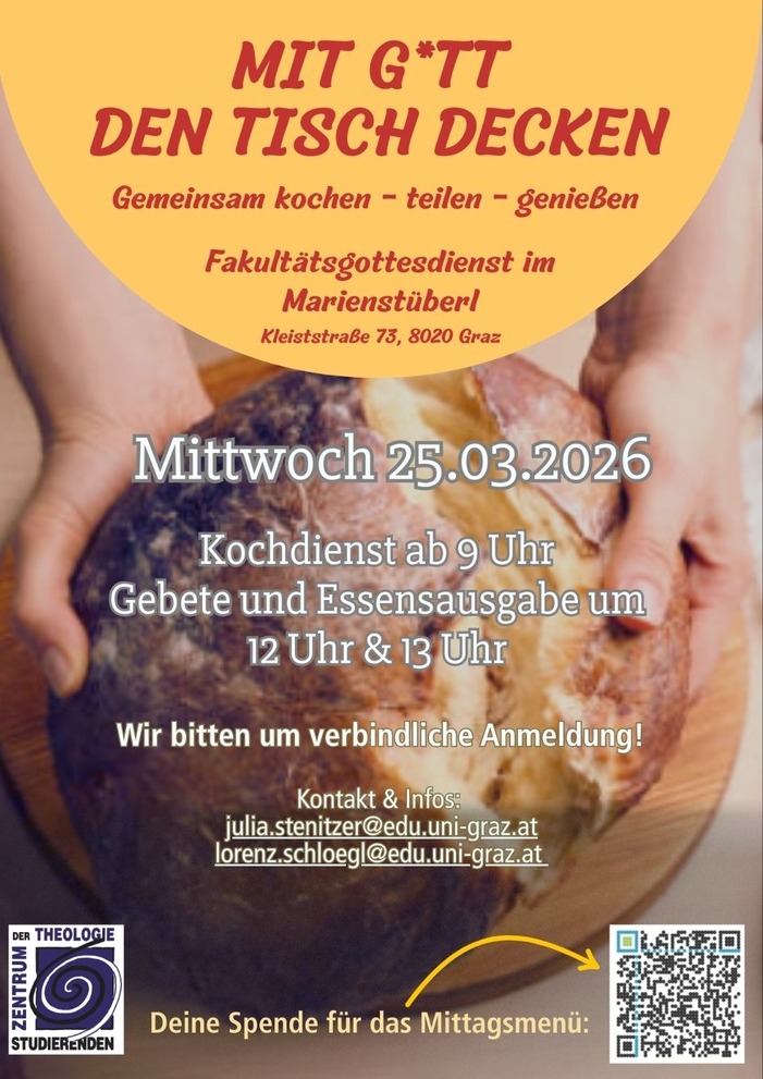 Mi 25. März, Fakultätsgottesdienst im Marienstüberl - das bedeutet Kochen ab 9.00 | 12.00 oder 13.00 Uhr Gebete. Noch wenige Restplätze. Anmeldung erforderlich. Info s.u. und bei Julia Stenitzer und Lorenz Schlögl
