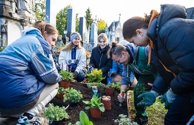 Neues Leben auf altem Stein: Beim 72h-Projekt auf dem Zentralfriedhof werden aufgelassene Steingruften mit Erde bedeckt und mit insektenfreundlichen Pflanzen naturnah bepflanzt. So wird der Friedhof wieder mehr zum "Ort des Lebens" - er bietet Nahrung und Lebensraum für Insekten, Kleinsäuger und Reptilien.