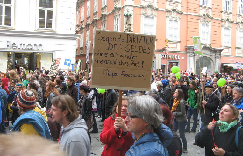 Unter den 1800 TeilnehmerInnen in Graz nahmen auch VertreterInnen der Katholischen Aktion, der Dreikönigsaktion, Welthaus und engagierte ChristInnen an der Demonstration teil. "Gegen den Fetischismus des Geldes und das Diktat der Wirtschaft ohne ein wirklich menschliches Ziel": (Papst Franziskus in Evangelii Gaudium)