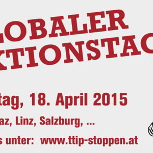 Am 18. April 2015 fand der weltweite Aktionstag gegen die Handelsabkommen TTIP, CETA und TiSA statt. Hunderttausende Menschen gingen auf die Straße und protestierten gegen Handelsabkommen, die Konzerninteressen über die Interessen von Mensch und Umwelt stellen. Auch in Wien, Salzburg, Linz, Klagenfurt, Graz, Innsbruck, Vöcklabruck, Freistadt, Wiener Neustadt, Villach und Gmunden gab es kreative Aktionen und Demos gegen TTIP, CETA und TiSA und für eine alternative Handelspolitik. Alle Infos und eine laufend aktualisierte Übersicht unter: www.ttip-stoppen.at/