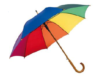 Holzstockschirm mit Rundhakengriff und Metallspeichen, Regenbogenfarben, Schließband mit Klettverschluss, Ø 103 cm