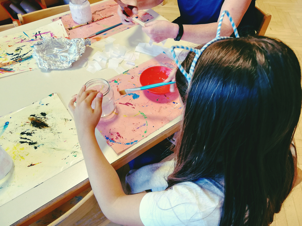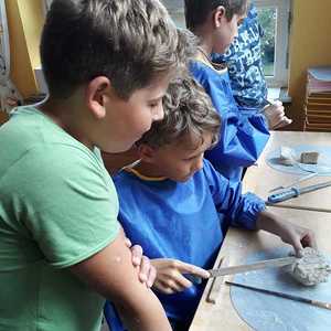 Kinder lieben zu gestalten und mit unterschiedlichen Materialien ihre Kreativität auszuleben. Sie stellen ihre Sicht der Wirklichkeit zur Welt, Gefühle und Erlebnisse dar. Jeder künstlerische Ausdruck ist ein Stück Selbsterfahrung und Persönlichkeitsentwicklung.¹ Eine Vielzahl an Bastelmaterialien, Farben, Werkstoffe wie Holz,Darstellungsmöglichkeiten und Bücher stehen ihnen zur Verfügung. Kinder können Geräte zerlegen und wieder zusammenbauen, außerdem „verschönern“ wir unseren Hort gemeinsam. Immer wieder gibt es kleine Projekte, in denen interessierte Kinder mit Schleifmaschine, Pinsel und Lack arbeiten. Die Kinder entscheiden, ob sie eigene Ideen umsetzen oder sich lieber an unseren Angeboten orientieren. Wichtig ist uns dabei nicht bewertend vorzugehen.