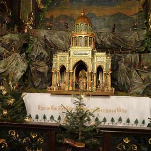 Fleißige Männerhände haben heute abends die Weihnachtskrippe in der Pfarrkirche umgebaut. An Stelle des Stalles wurde ein schöner Tempel aufgebaut.