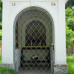 Außerdem wurden die beiden vorhandenen Holztüren durch ein verzinktes Eisengitter mit Schloss ersetzt. Ein Betstuhl aus Holz wurde extra für den Innenraum angefertigt.