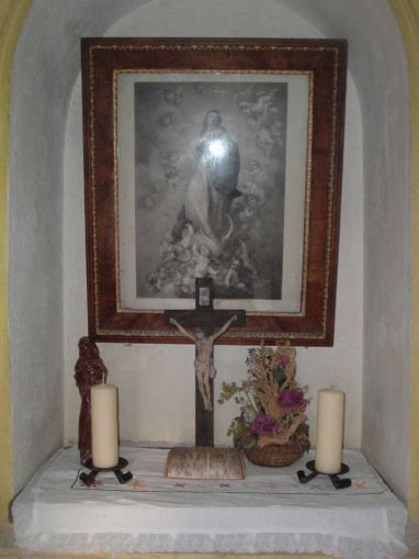 Über dem Eingangstor befindet sich ein vierfärbig verglastes Rundfenster, durch das Licht auf die Mariendarstellung fällt, und von den Seiten lassen zwei vergitterte und mit Blumenkisterln geschmückte Rundbogenfenster die Helligkeit auf den Fliesenboden herein. Rund um die Kapelle wurden Steinplatten verlegt und das Ziegeldach wird von einem wunderbaren gusseisernen Kreuz gekrönt.
