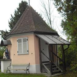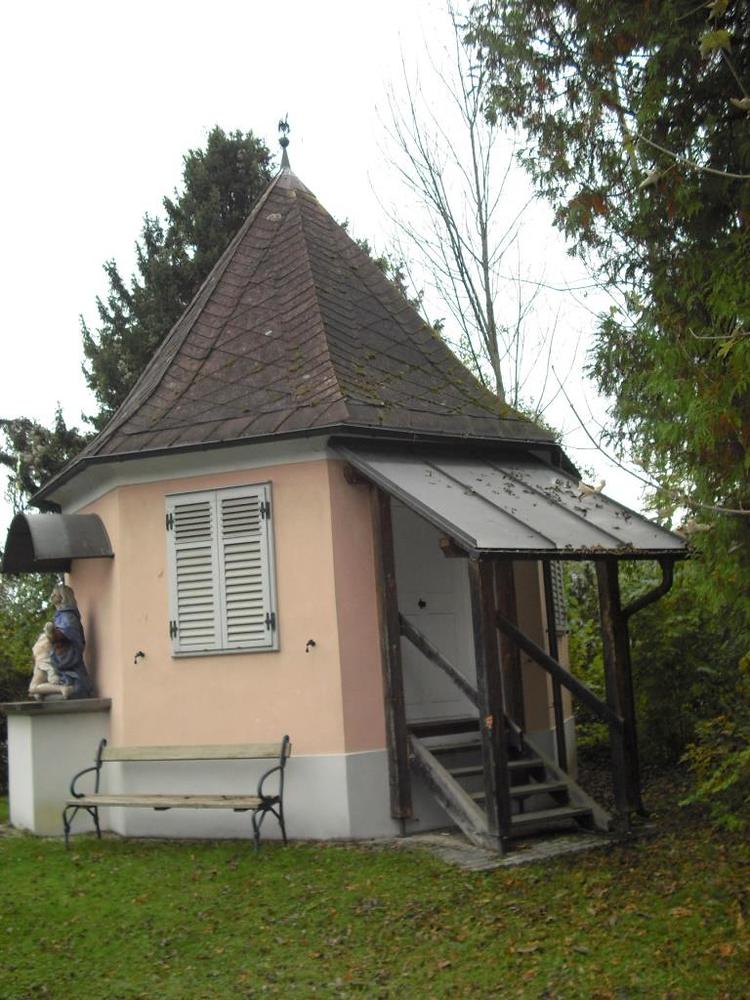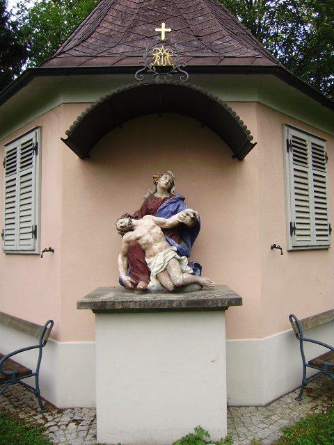 Am westlichsten Ende des Gartens befindet sich ein barocker achteckiger Pavillon aus dem 18. Jahrhundert. An der östlichen Wand dieses Bauwerkes steht auf einem Sockel unter einem gebogenen Dach eine farbige steinerne Pietagruppe, die aus der der Zeit um 1730 stammt und der zweifellos hohem künstlerischen Wert zukommt. Das schmucke Gartenhäuschen aus der Spätphase des Barocks zählt damit zu den älteren Gebäude der heutigen Stadtgemeinde. Die Pieta (italienisch: 'Frömmigkeit, Mitleid') ist in der bildenden Kunst die Darstellung Marias als Mater Dolorosa mit Leichnam des vom Kreuz abgenommenen Jesus Christus.