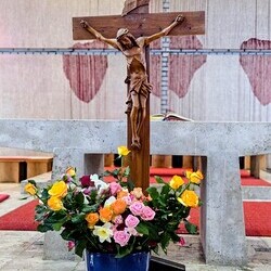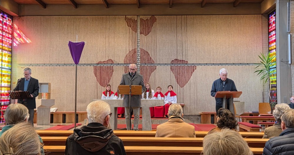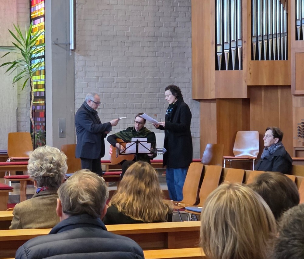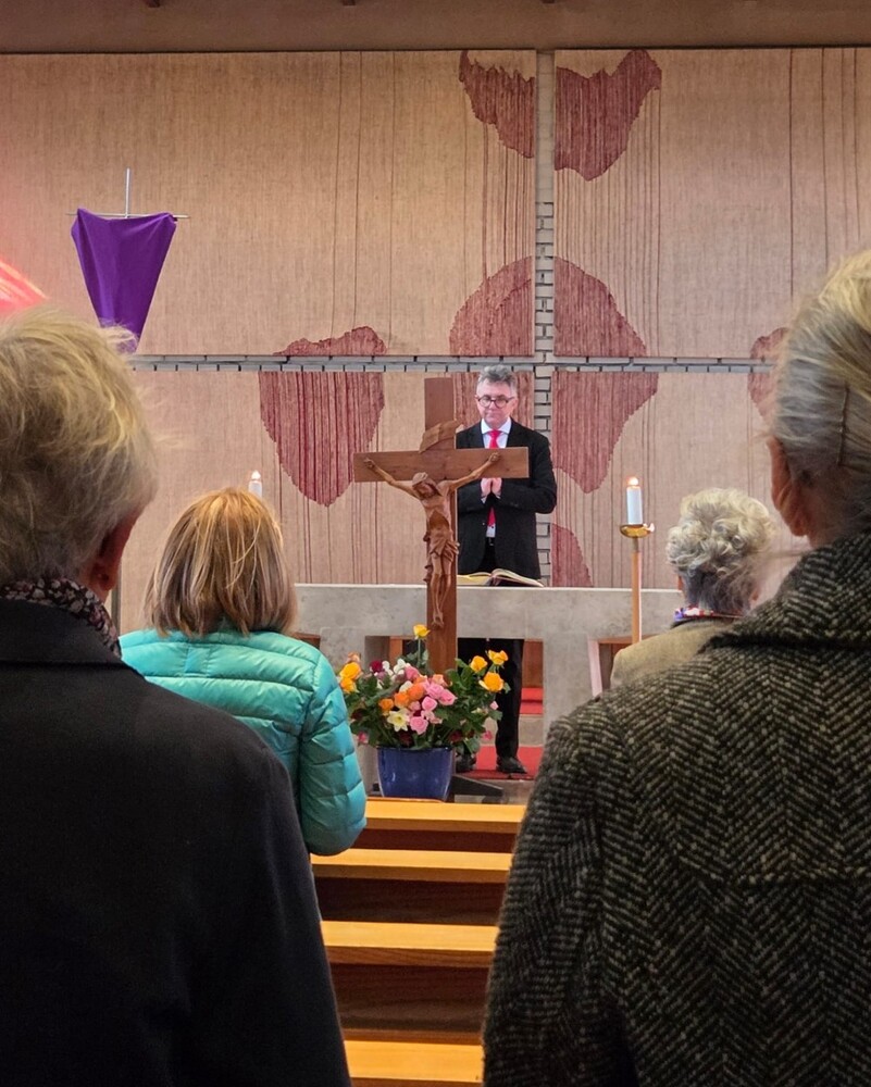 Der Karfreitag wurde in Stille vor dem leergeräumten Altar mit den Zeichenhandlungen der Kreuzverehrung, den großen Fürbitten und der Grablegung begangen. Gestaltet wurde die liturgische Feier von Thomas Possert und einem Ensemble rund um Siegfried Kager.