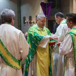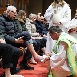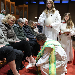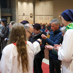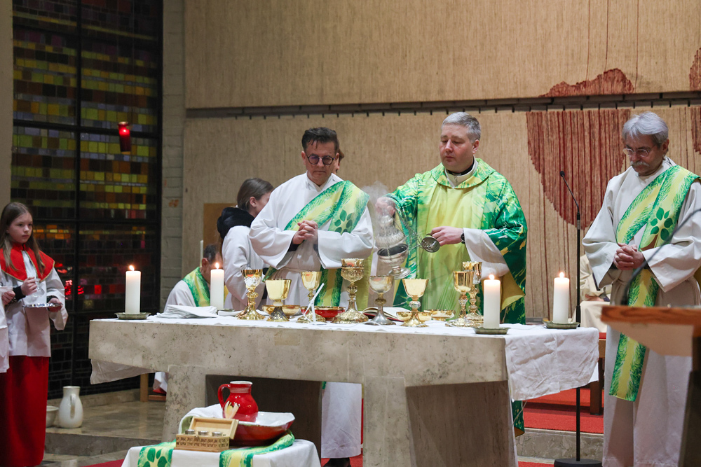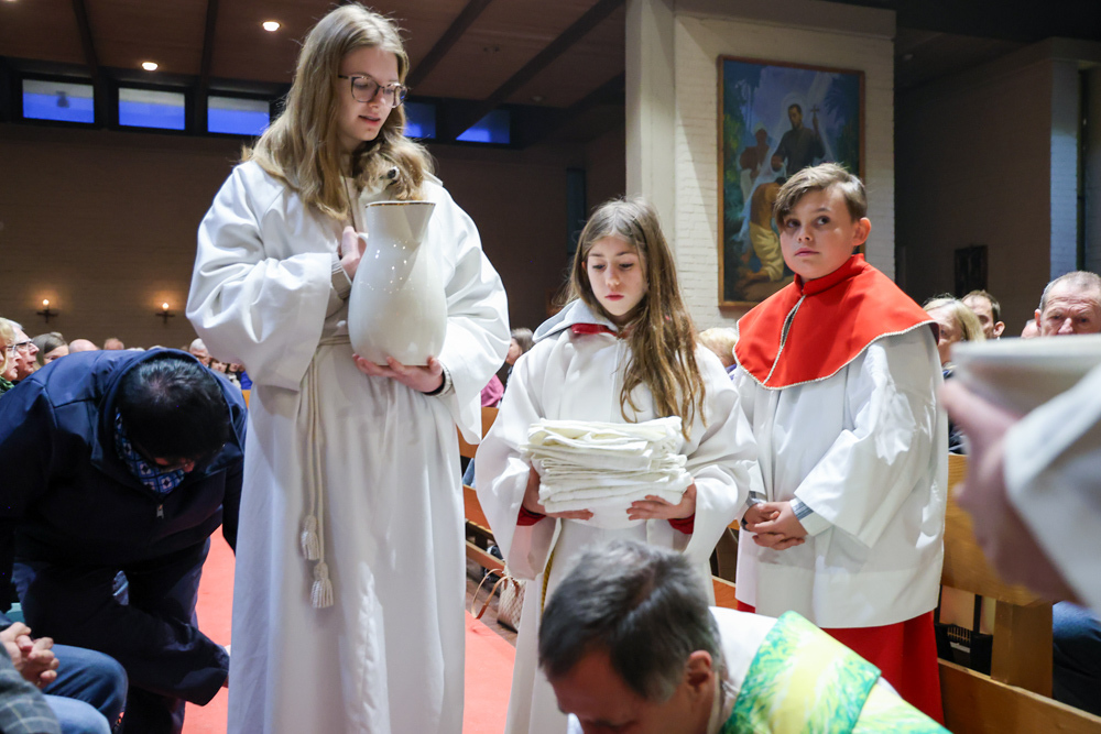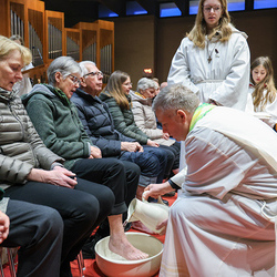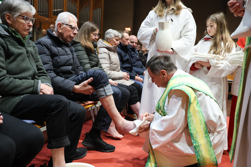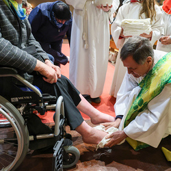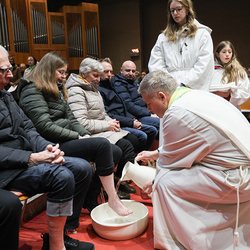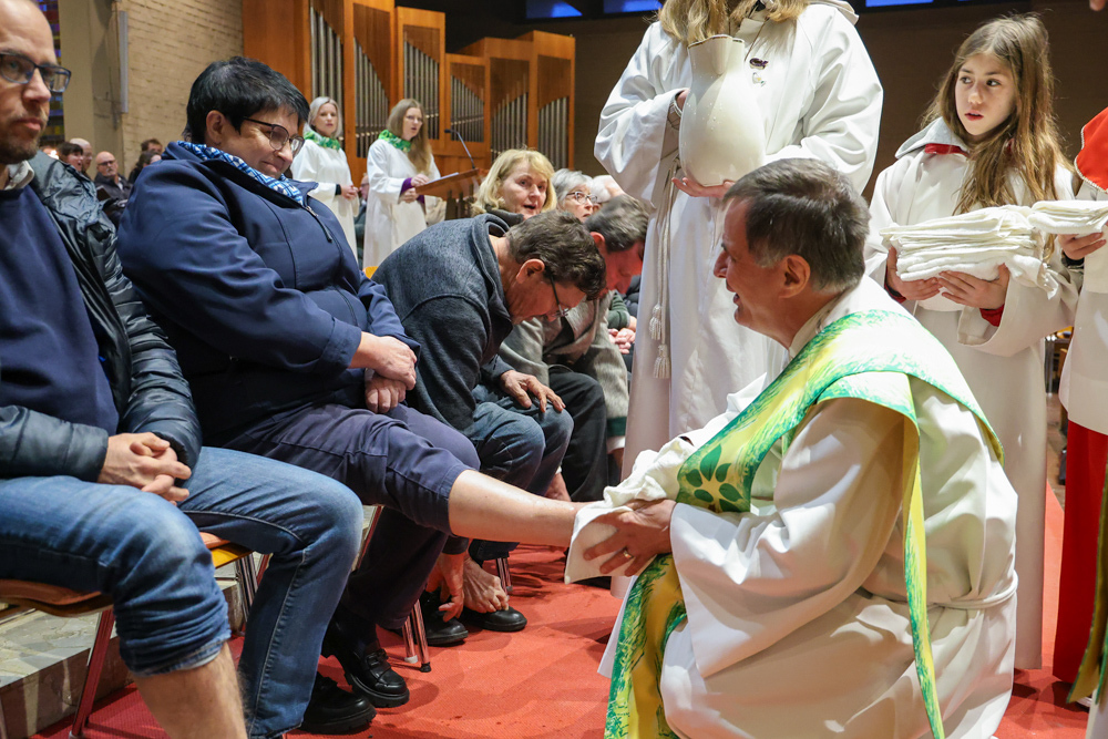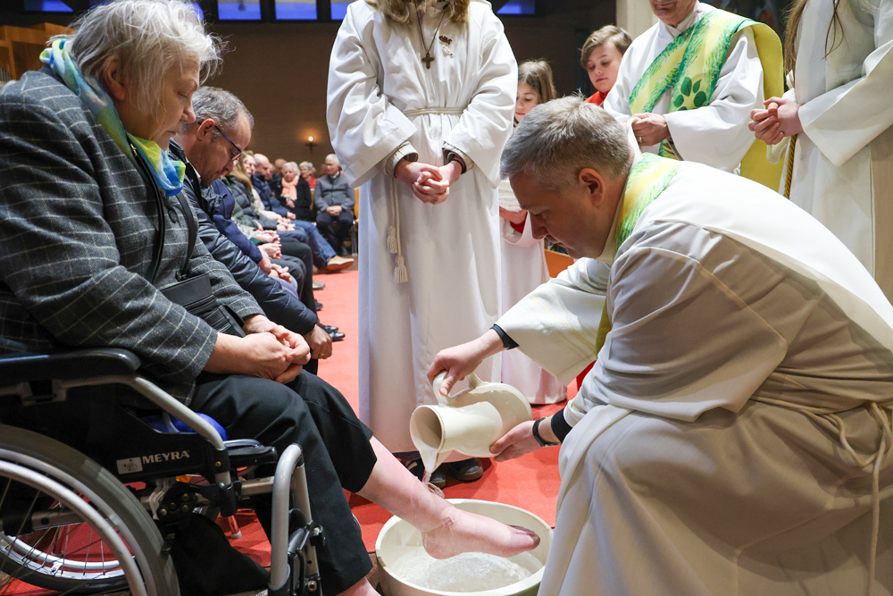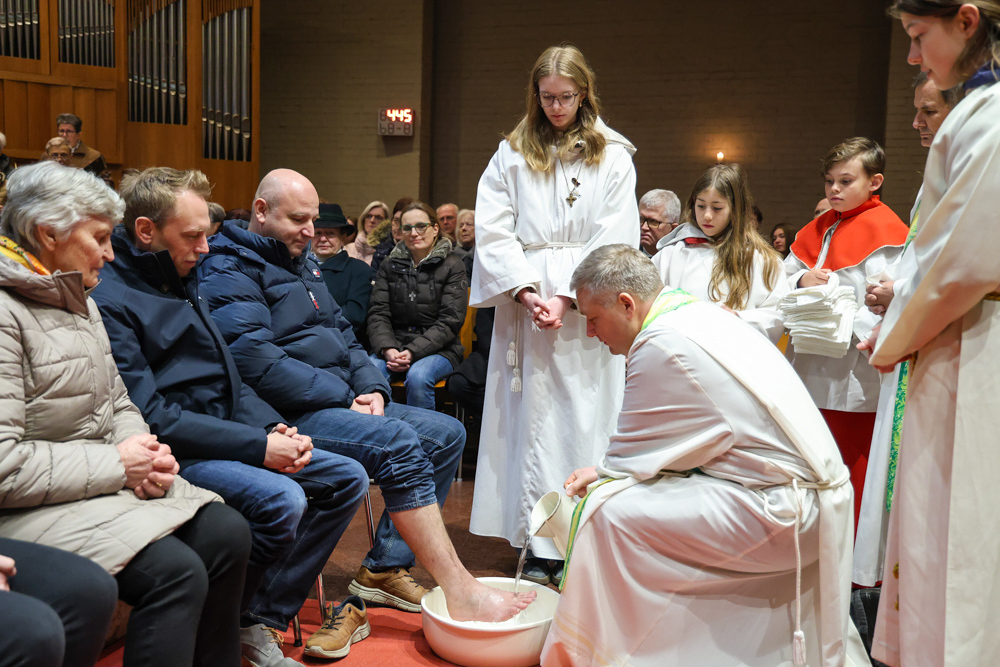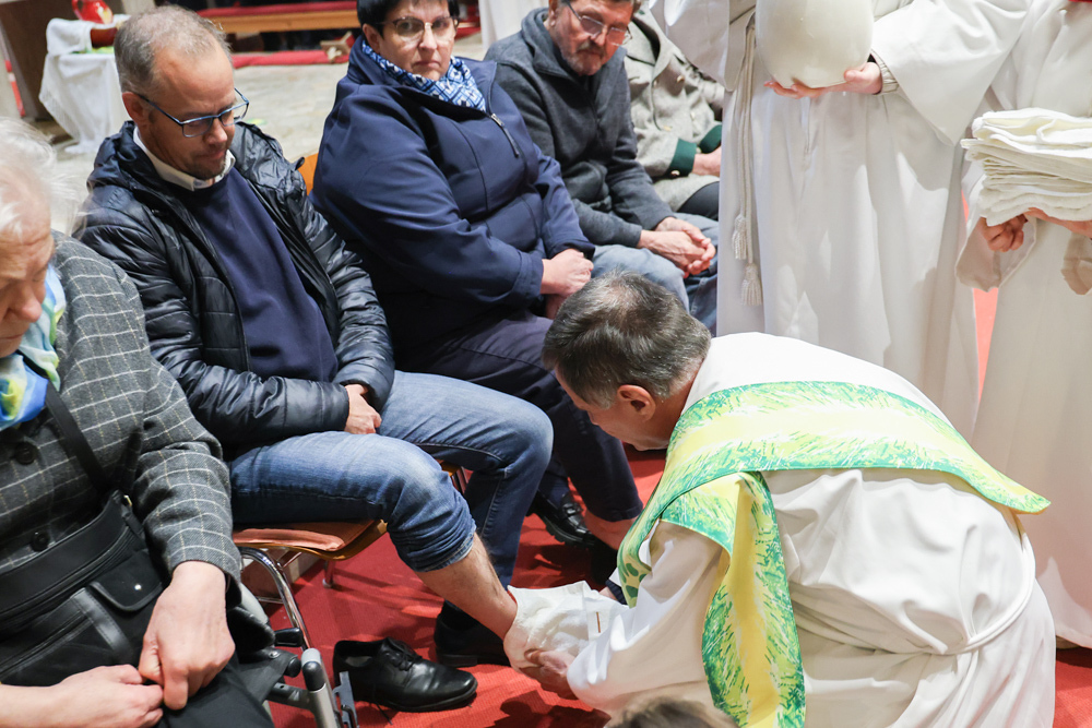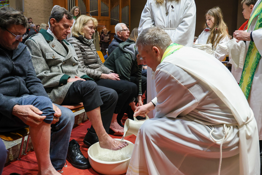 Bei diesem Mahl nahm Jesus das Brot, brach es, reichte es seinen Jüngerinnen und Jüngern und sagte: „Das ist mein Leib, der für euch hingegeben wird.“ Doch Jesus ging noch einen Schritt weiter: Er wusch die Füße seiner Freunde – nicht als Zeichen von Macht, sondern von Liebe und Dienstbereitschaft. Deshalb wurden stellvertretend zwei Personen jeder Pfarre von Pfarrer Claudiu Budău und Diakon Franz Habith die Füße gewaschen.