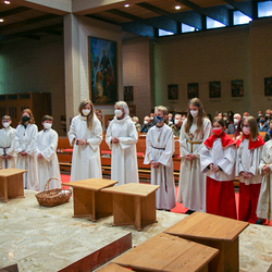 In einer etwas anders gestalteten Fußwaschung wurde jenen gedacht, die nicht oder nicht mehr am Leben der Kirche teilnehmen können oder möchten. Die Stühle blieben leer. Symbolisch für Rand- und Zielgruppen und jene Menschen, die unsere Gesellschaft mitprägen, wurden Kerzen entzündet. Als Zelebranten fungierten unsere drei Priester, drei Diakone sowie alle Pastoralreferentinnen und Referenten, welche den Sendungsauftrag im Seelsorgeraum Kaiserwald erfüllen.