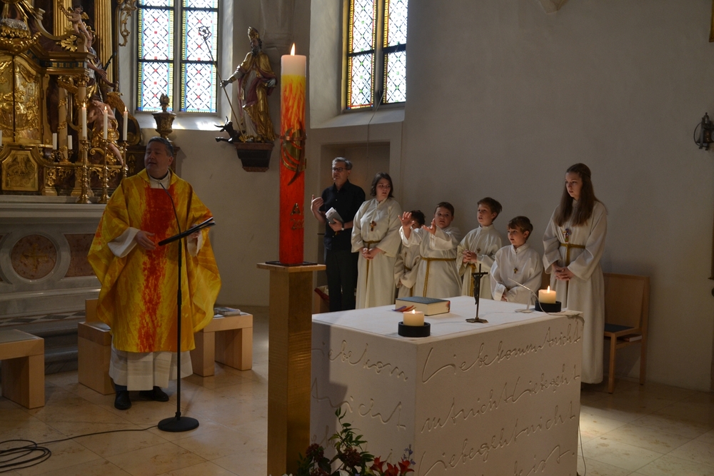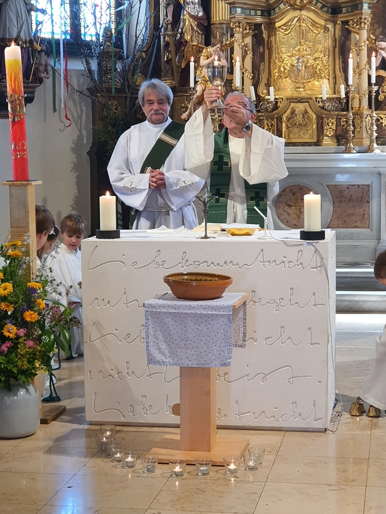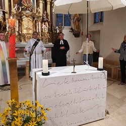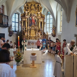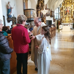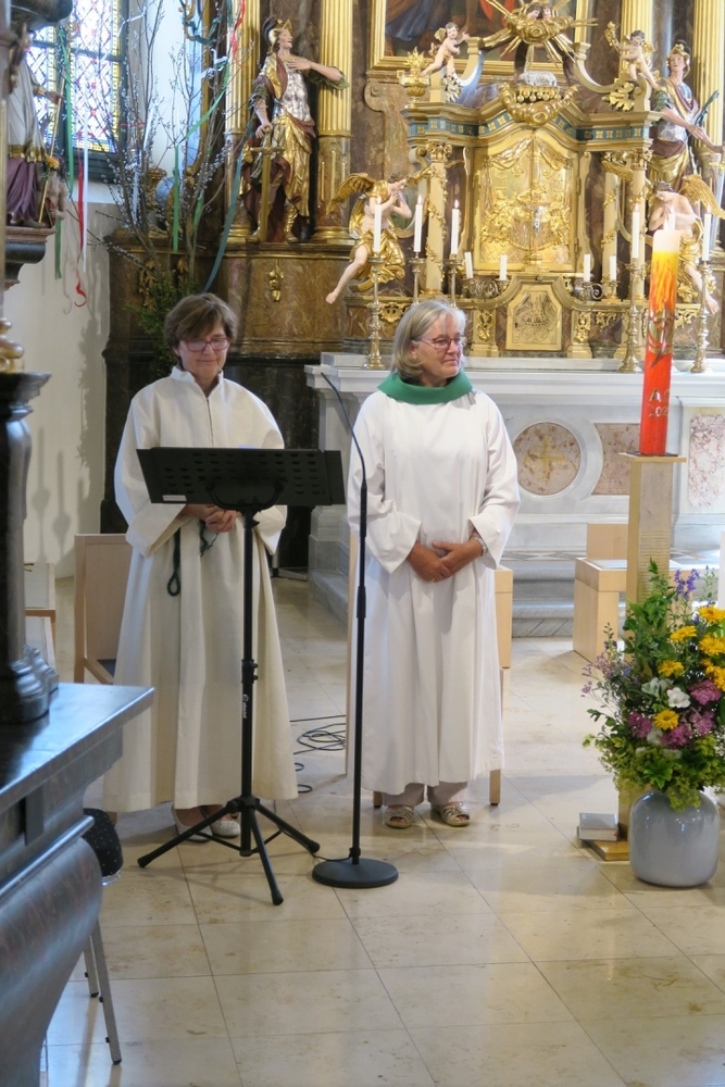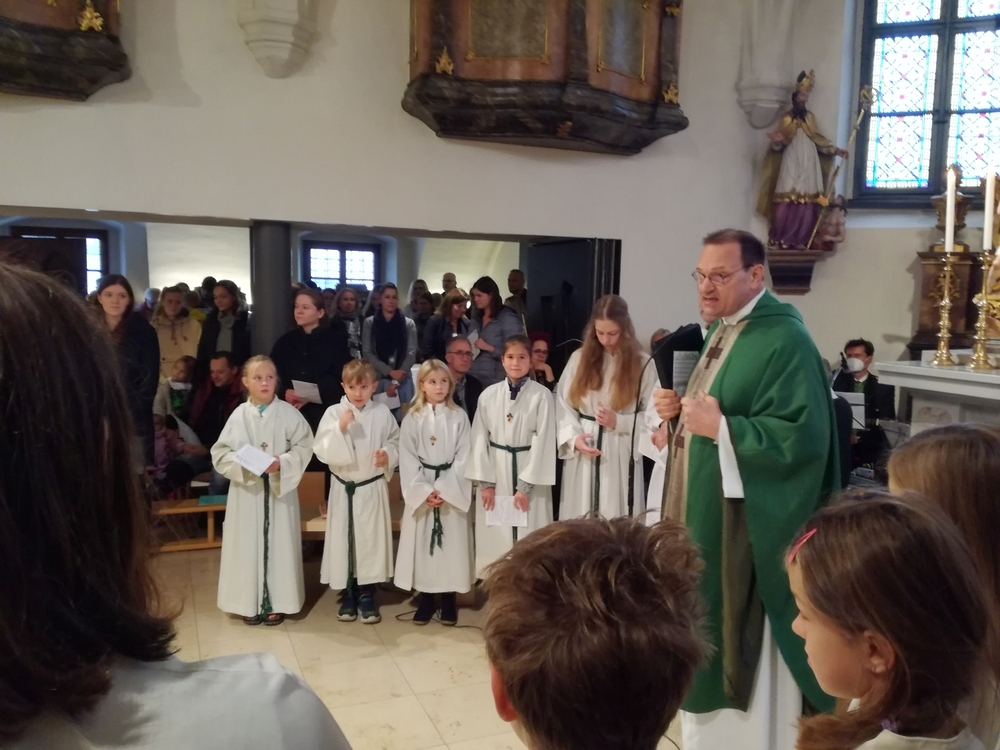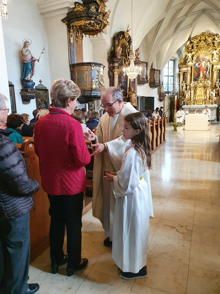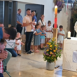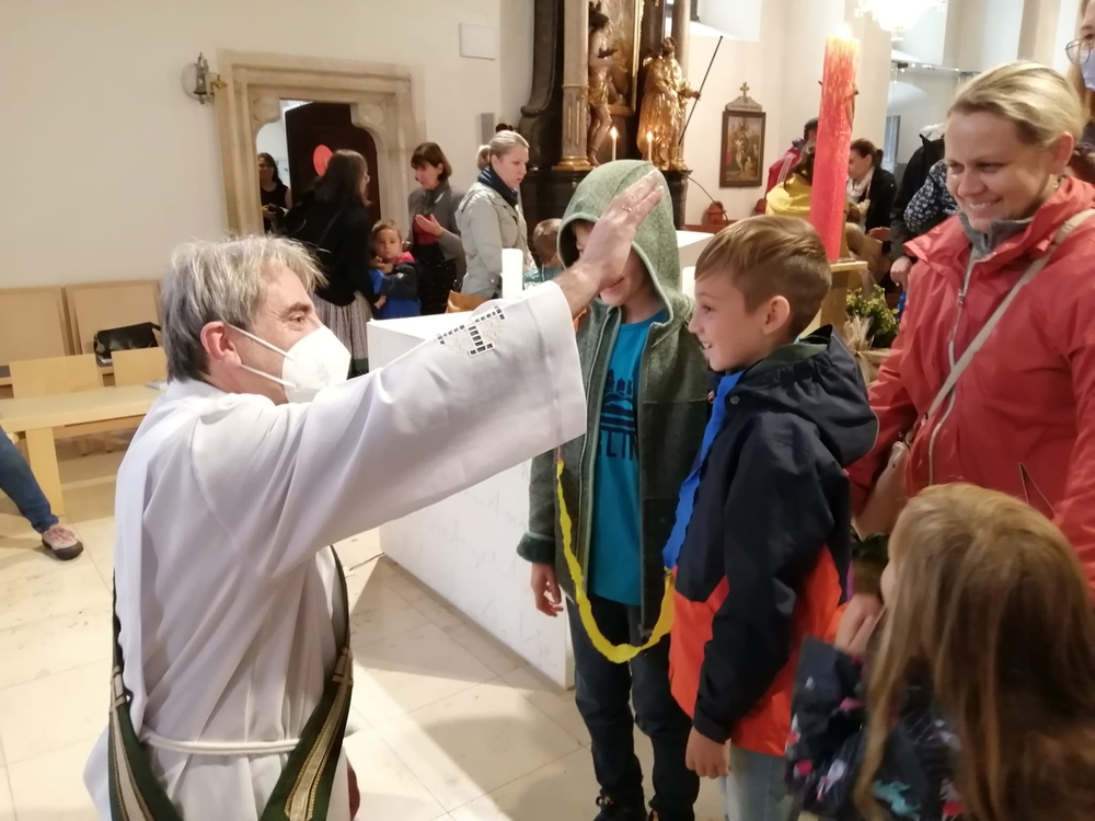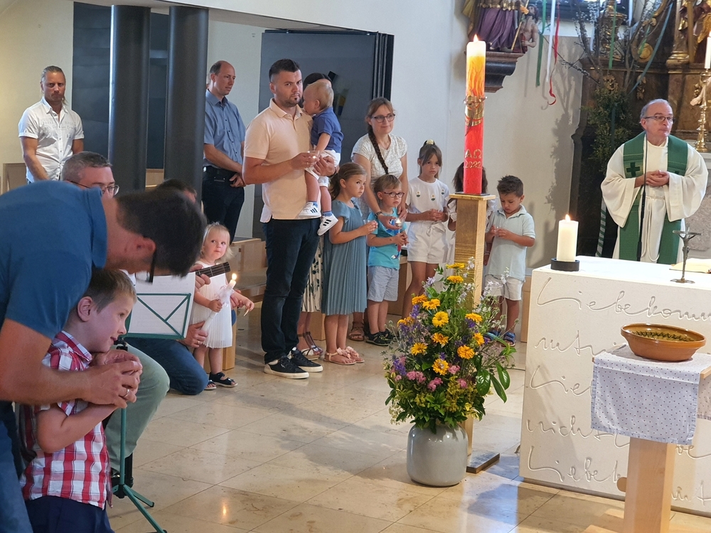 Am Sonntag den 26. Juni haben wir mit den Täuflingen der Corona Zeit einen Familiengottesdienst gefeiert. Die anwesenden Kinder wurden mit frisch gesegnetem Wasser während der Kommunionausteilung zur Erinnerung an ihre Taufe gesegnet. Die beiden Taufbewerber Mehri und Ali aus dem Iran wurden bei diesem Gottesdienst vorgestellt und mit dem Katechumenenöl gesalbt.