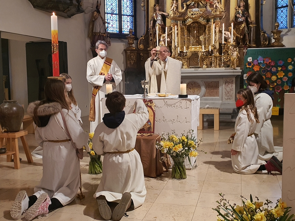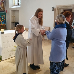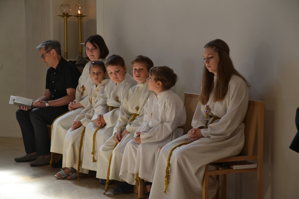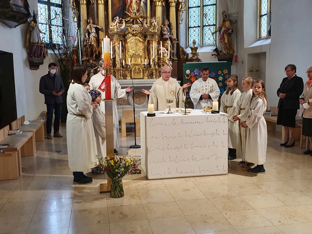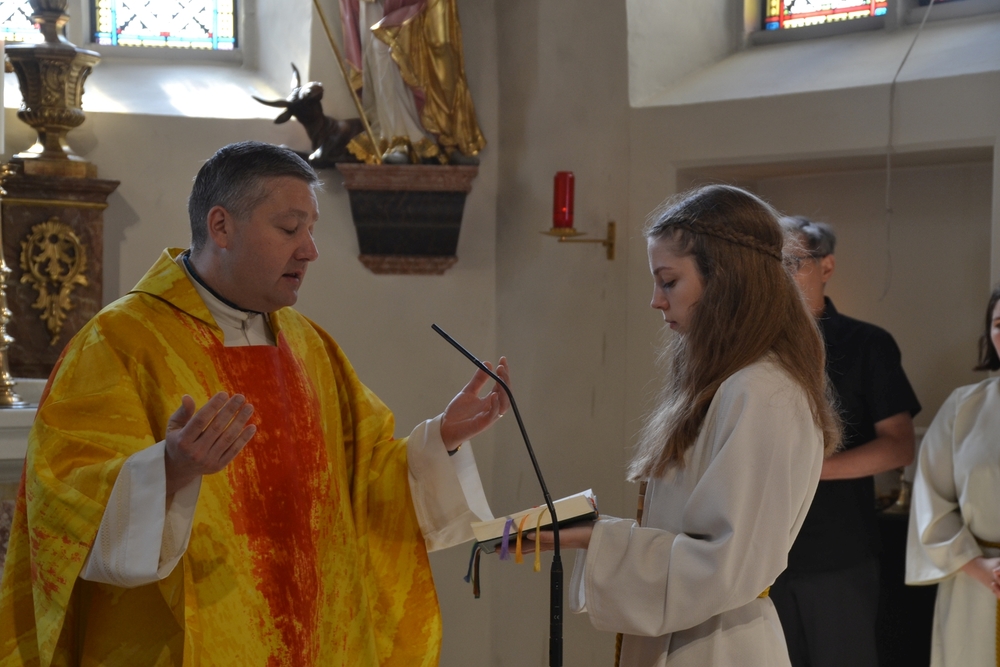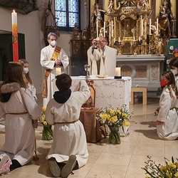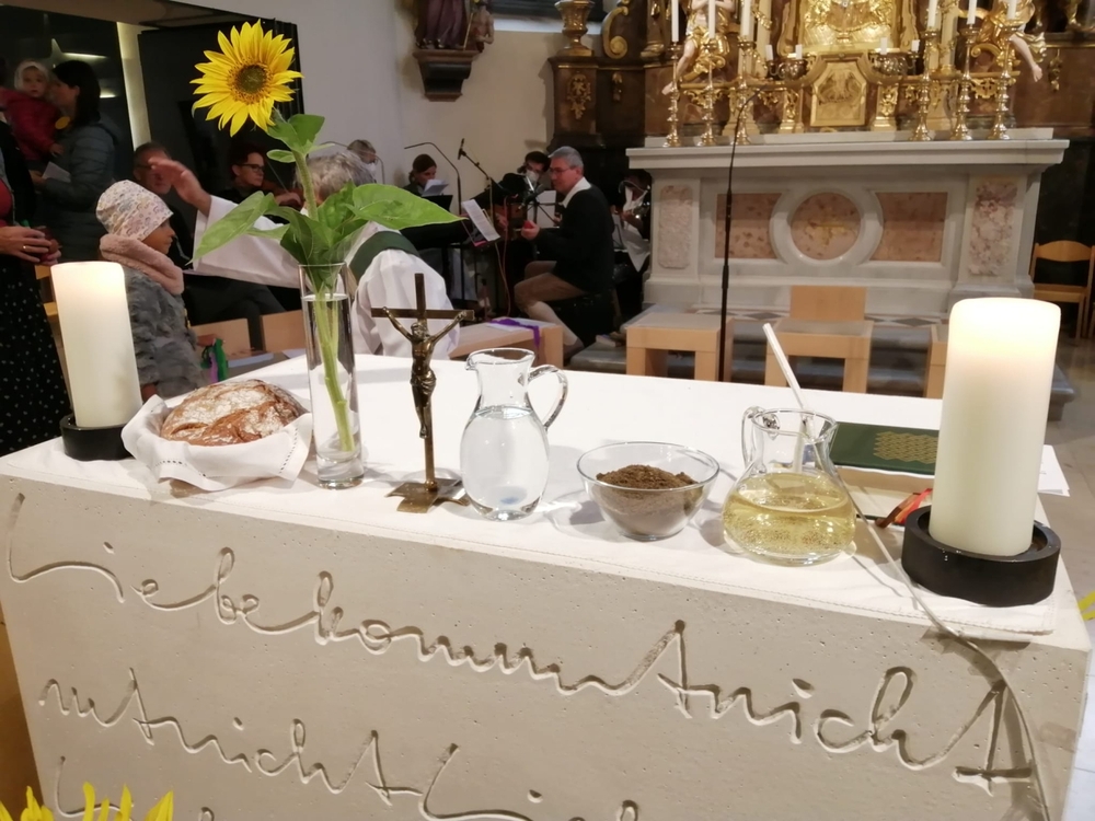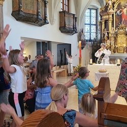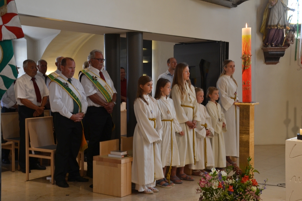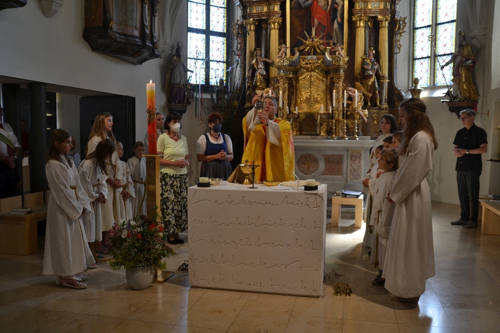 Am Sonntag den 26. Juni haben wir mit den Täuflingen der Corona Zeit einen Familiengottesdienst gefeiert. Die anwesenden Kinder wurden mit frisch gesegnetem Wasser während der Kommunionausteilung zur Erinnerung an ihre Taufe gesegnet. Die beiden Taufbewerber Mehri und Ali aus dem Iran wurden bei diesem Gottesdienst vorgestellt und mit dem Katechumenenöl gesalbt.