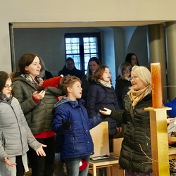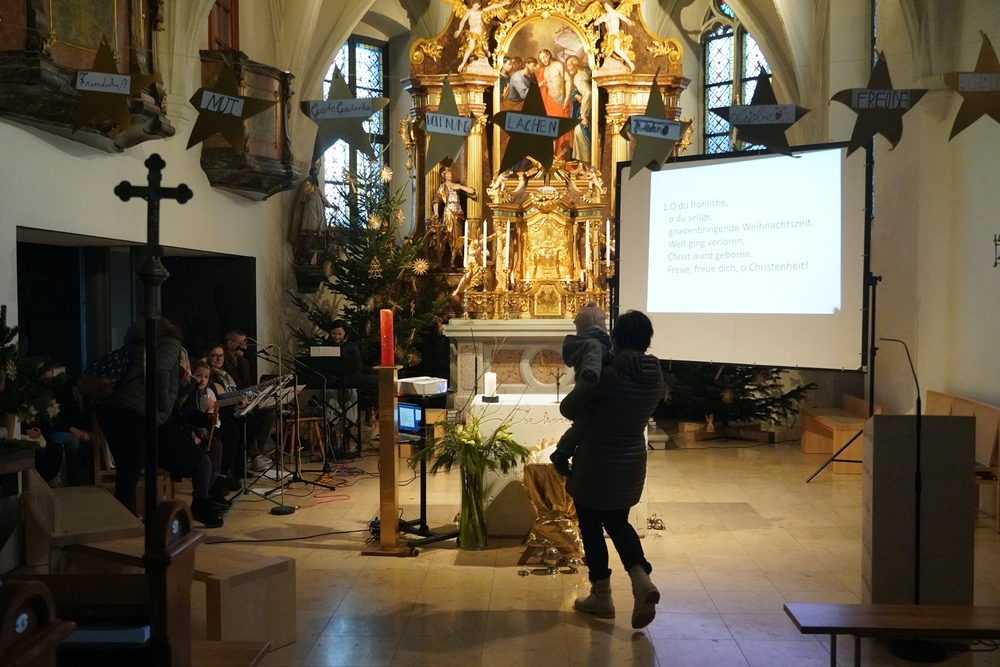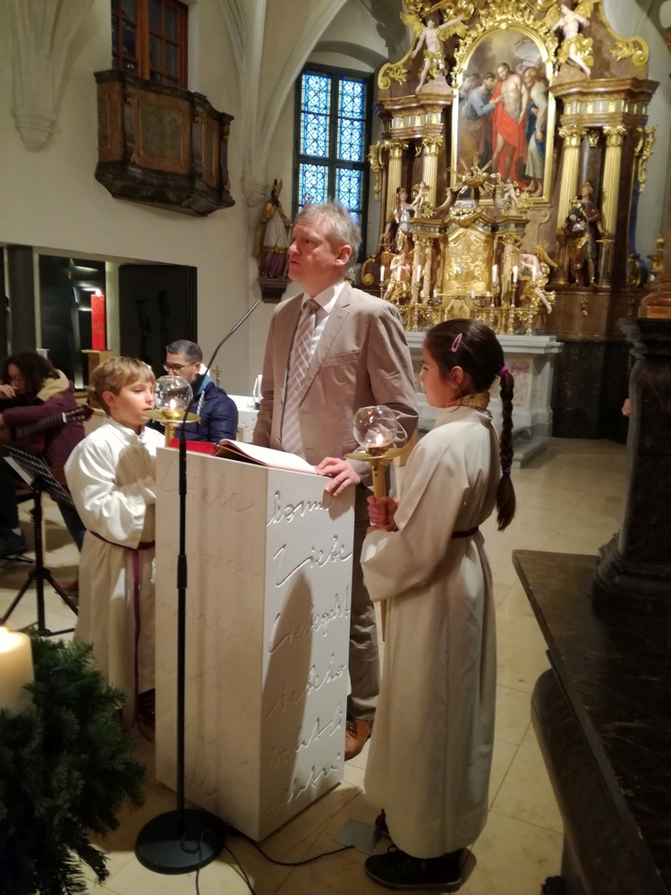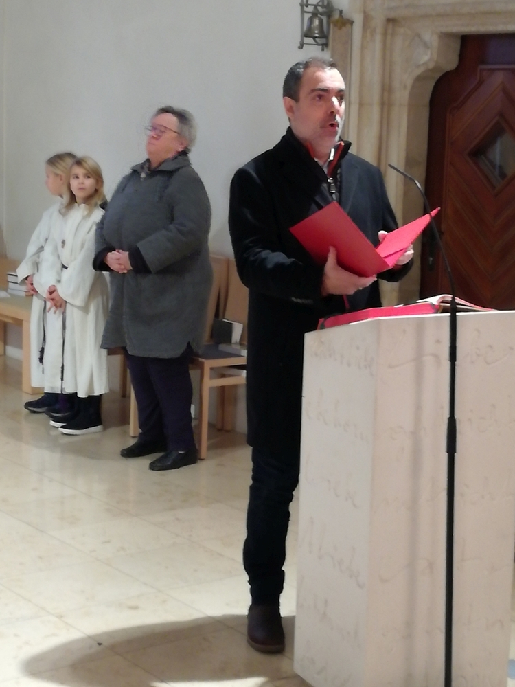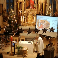 Die Christmette, dieses Mal eine Wort-Gottes-Feier mit Kommunionspendung, feierte Diakon Wolfgang Garber mit uns. In seiner Predigt lud er uns ein, es Weihnachten werden zu lassen, indem wir uns „in die Krippe unseres Nächsten“ legen, d.h. achtsam und einfühlsam mit unseren Mitmenschen umgehen, sodass „Menschwerdung“ erfahrbar wird. Stimmungsvolle Weihnachtslieder erfüllten die abendliche Kirche und die Herzen.