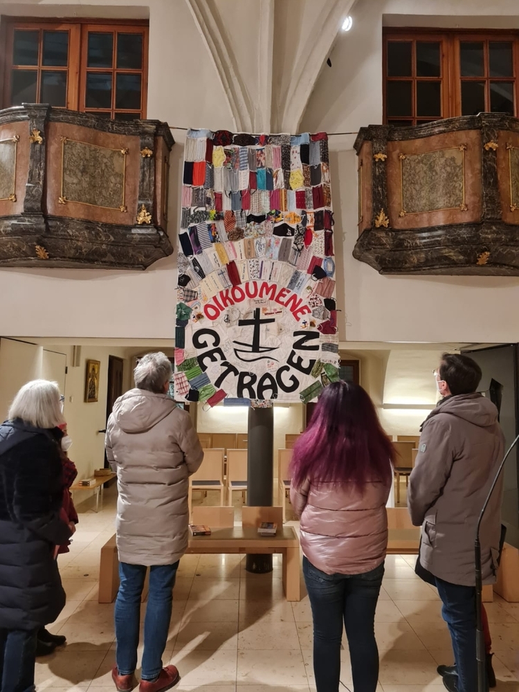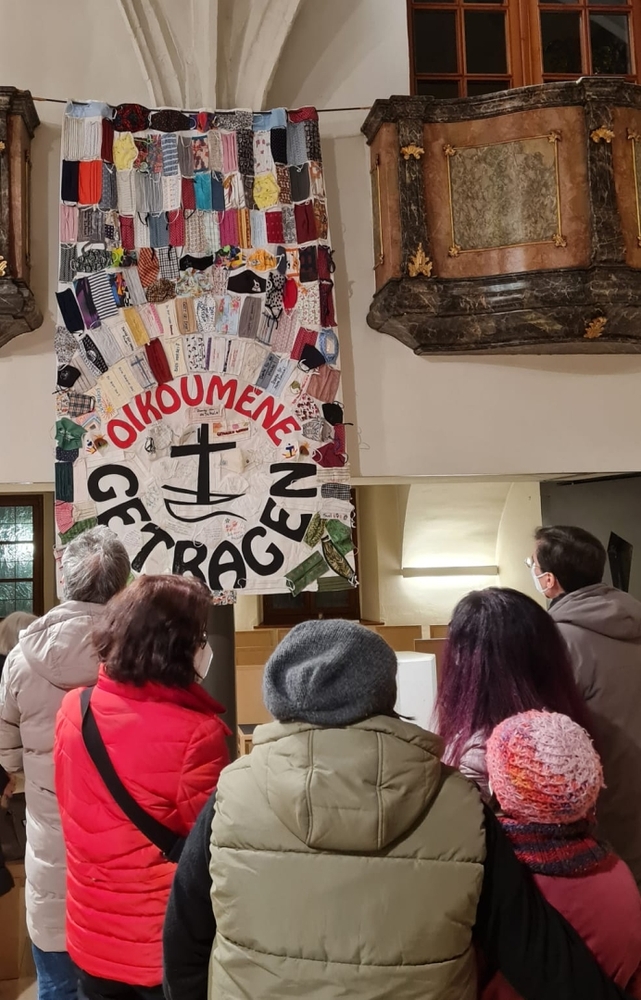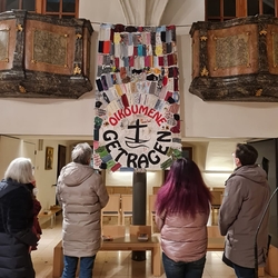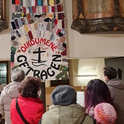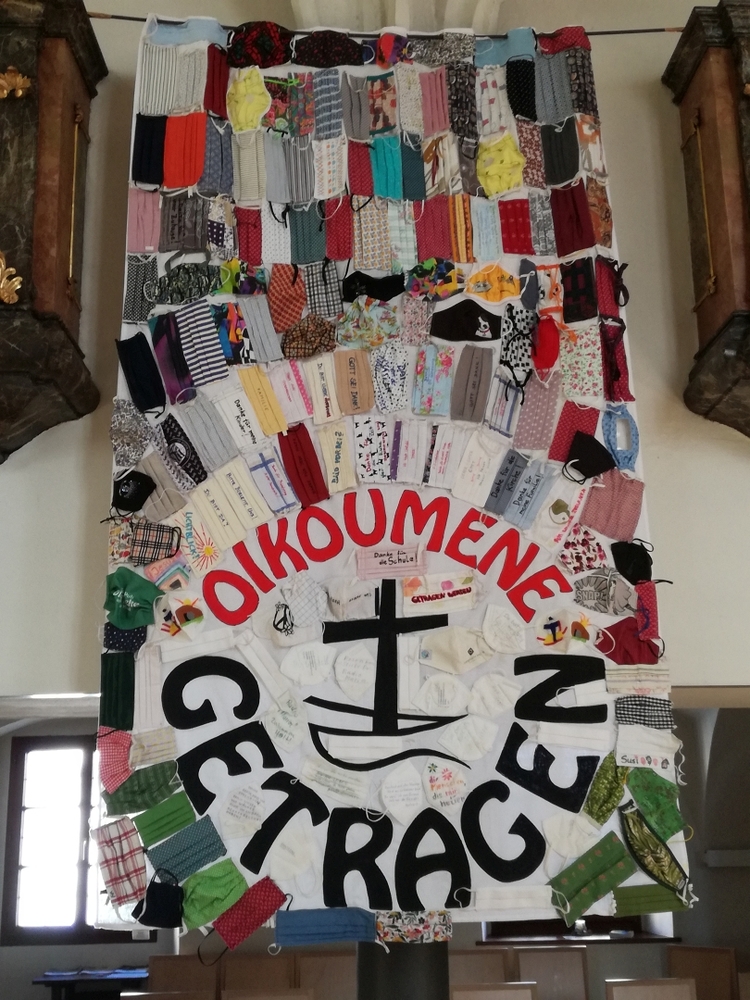 Wir sind von Gott getragen - in der Pandemie und anderen Nöten des Lebens! Diese zentrale Botschaft des ökumenischen Getragen-Tuches, das bis Mitte März in unserer Kirche zu betrachten ist, wurde beim Aschermittwoch-Gottesdienst von Vikar Gerhard Hatzmann und Birgit Zepf sehr schön erläutert. Getragen-Tuch und Aschenkreuz – zwei starke Symbole zu Beginn der Fastenzeit!