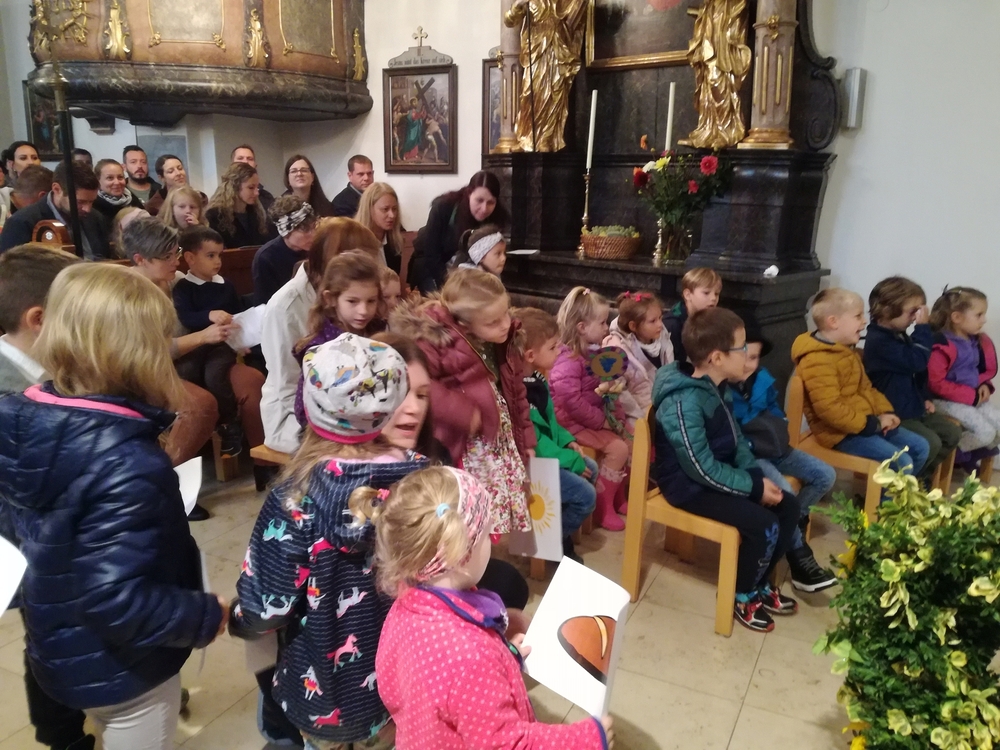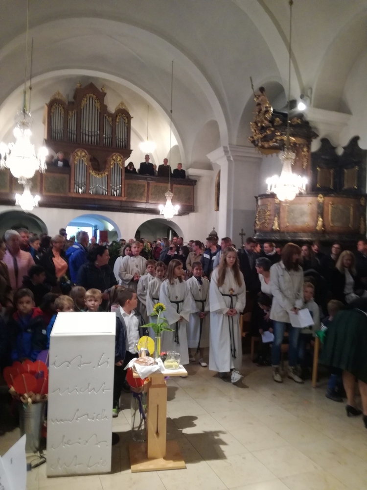 Mit dem Begrüßungssatz „Heute gießt der liebe Gott die Blumen!“, zauberte Vikar Gerhard Hatzmann – in Anspielung auf das Regenwetter – allen großen und kleinen Menschen in unserer Pfarrkirche ganz schnell ein Lächeln ins Gesicht. Eine wunderbare, fröhliche Erntedankfeier folgte.