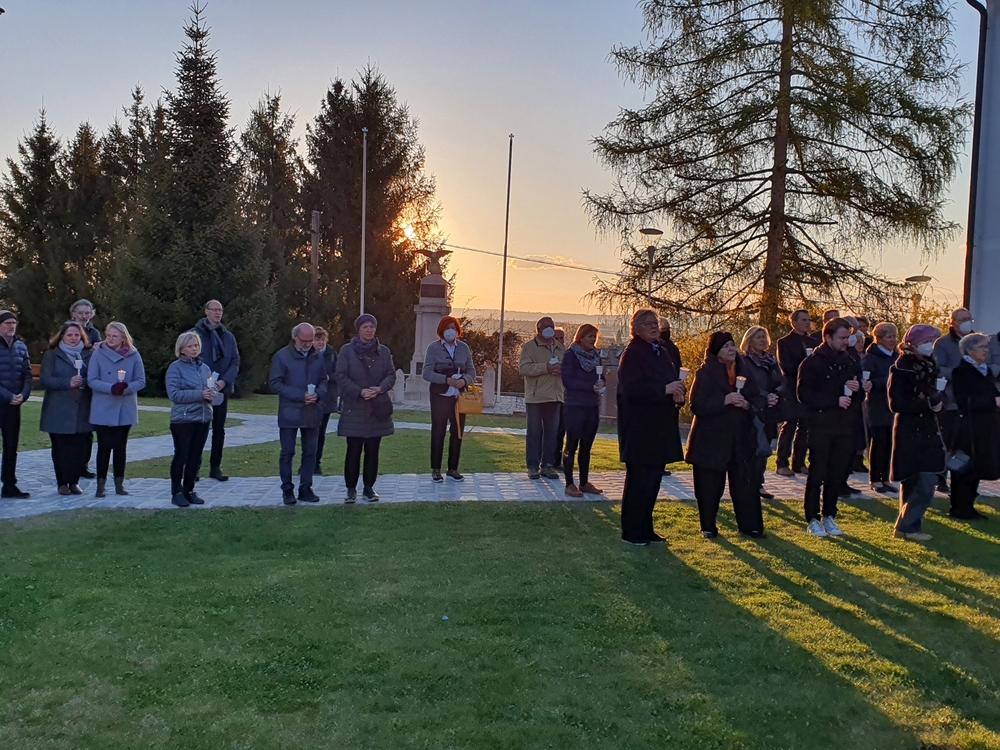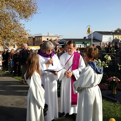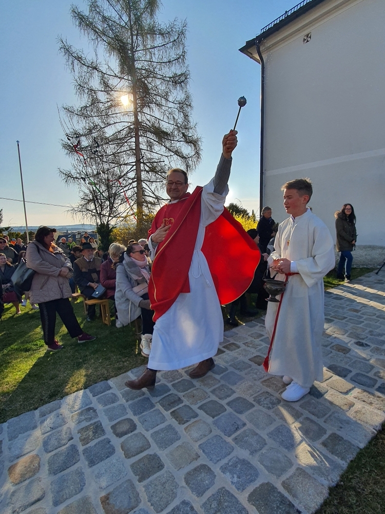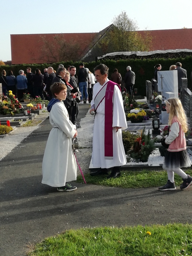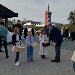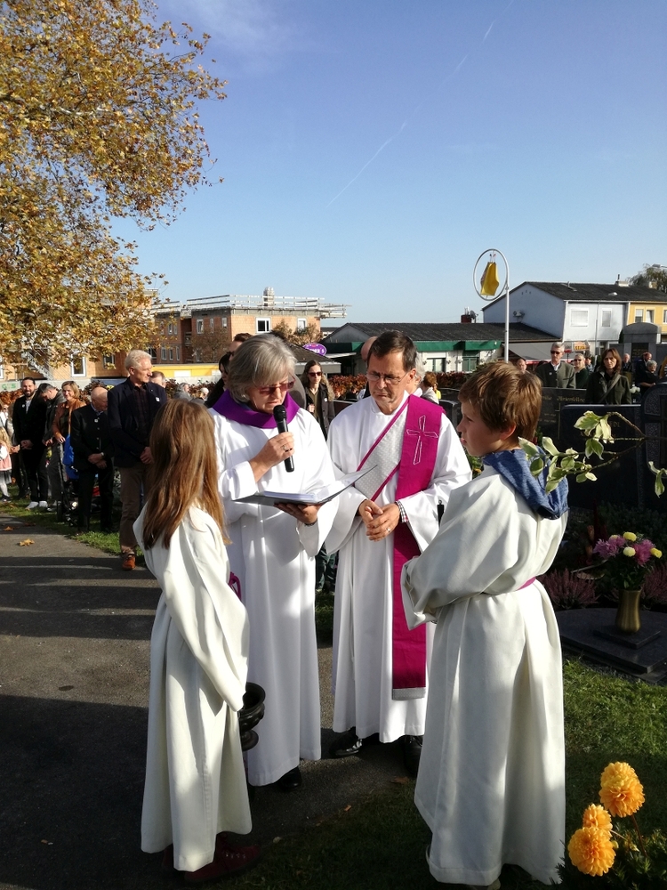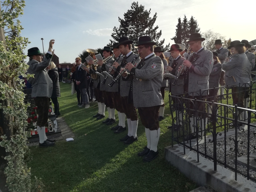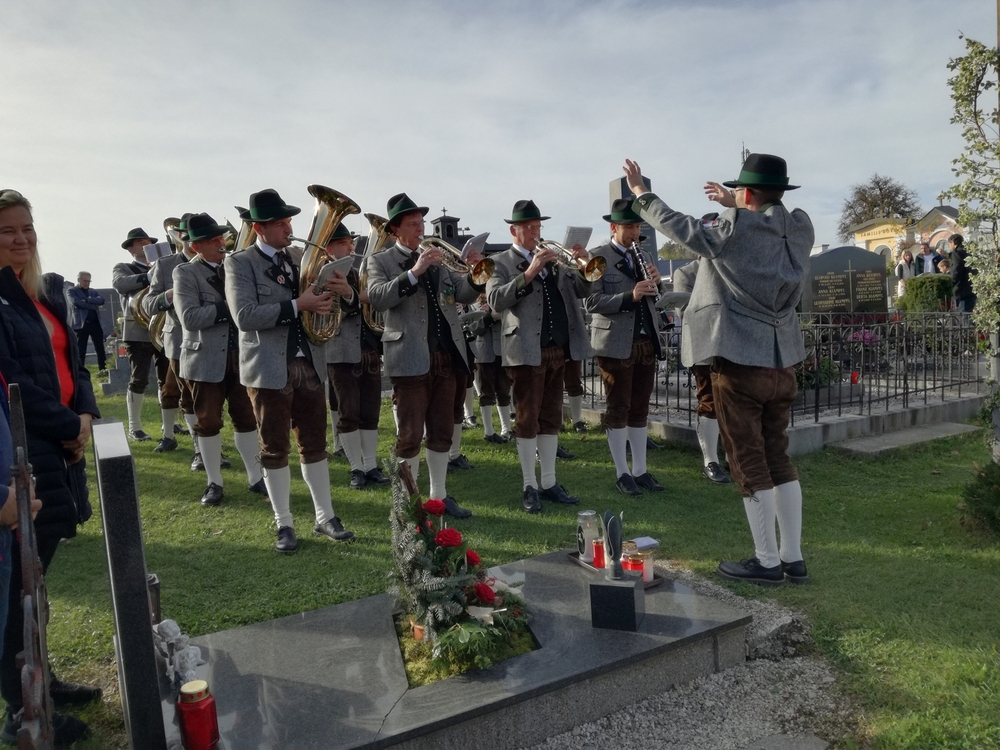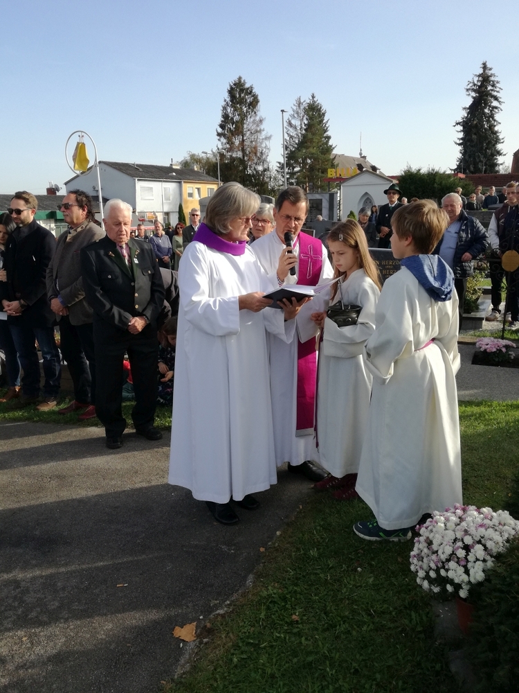 Bei strahlendem Herbstwetter nahmen zu Allerheiligen viele Menschen an der Feier auf unserem Friedhof teil. Mit berührenden Texten vermittelten Christa und Diakon Franz Habith den FriedhofbesucherInnen die zentrale Hoffnung unseres christlichen Glaubens, dass unsere lieben Verstorbenen neues Leben bei Gott erwarten dürfen. Die Namen der im letzten Jahr Verstorbenen wurden vorgelesen. Musikalisch wurde die Feier von der MUZ festlich umrahmt. Nach der Gräbersegnung boten unsere Minis ihre selbst gebackenen Allerheiligenstriezerl an. Danke für die freiwilligen Spenden!