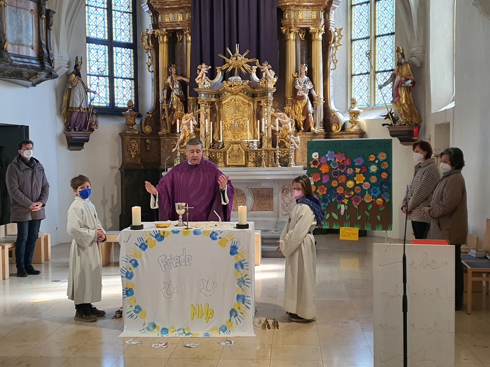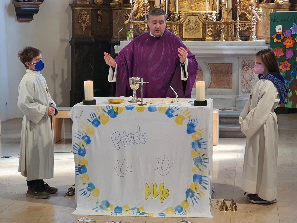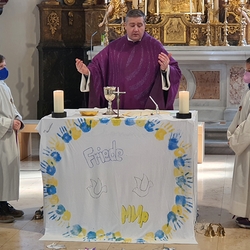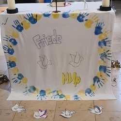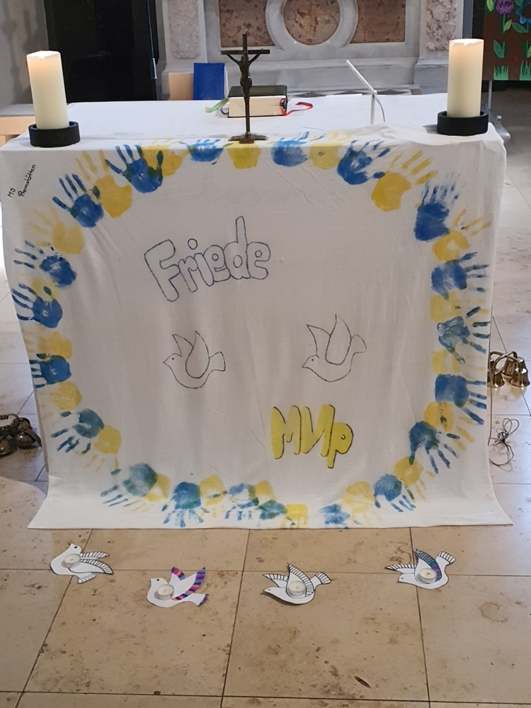 Ein „Altartuch für den Frieden“ ziert nun unseren Altar. Es stammt von den SchülerInnen der 1. Klassen der MS-Premstätten. Danke Frau RLn Elisabeth Kormann für das schöne Tuch, ein wunderbares Zeichen für Solidarität und den ersehnten Frieden in der Ukraine!