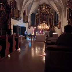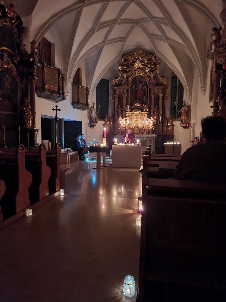 Beim Allerseelengottesdienst gedachten wir all unserer Verstorbenen. Für die im letzten Jahr Verstorbenen unserer Pfarre, deren Namen nochmals vorgelesen wurden,  brannten 59 Teelichter. Die 60. Kerze wurde für alle ungenannten Verstorbenen entzündet. Das „Lichtermeer“ vor dem Altar verweist hoffnungsvoll auf das Licht der Auferstehung für unsere lieben Verstorbenen!