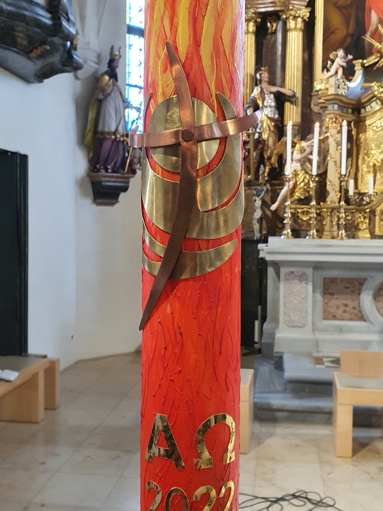 Diese Botschaft symbolisiert - über die österliche Auferstehungsfeier hinaus - die wunderschöne Osterkerze, gestaltet von Maria und Martin Kirchberger.