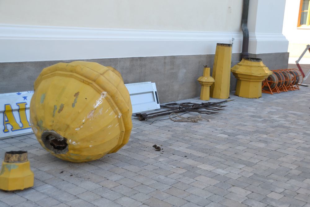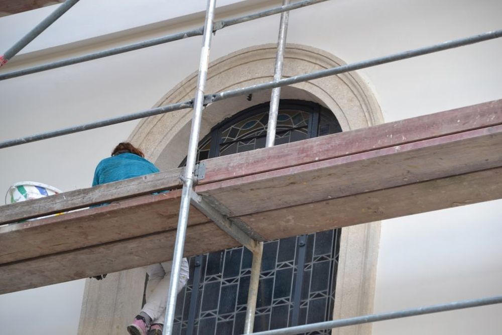 Gleichzeitig arbeiteten die Steinrestauratoren an den Fenster- und Türumrandungen und dem Sockel.